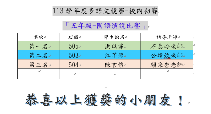 113學年度多語文競賽-五年級國語演說比賽(成績公告)