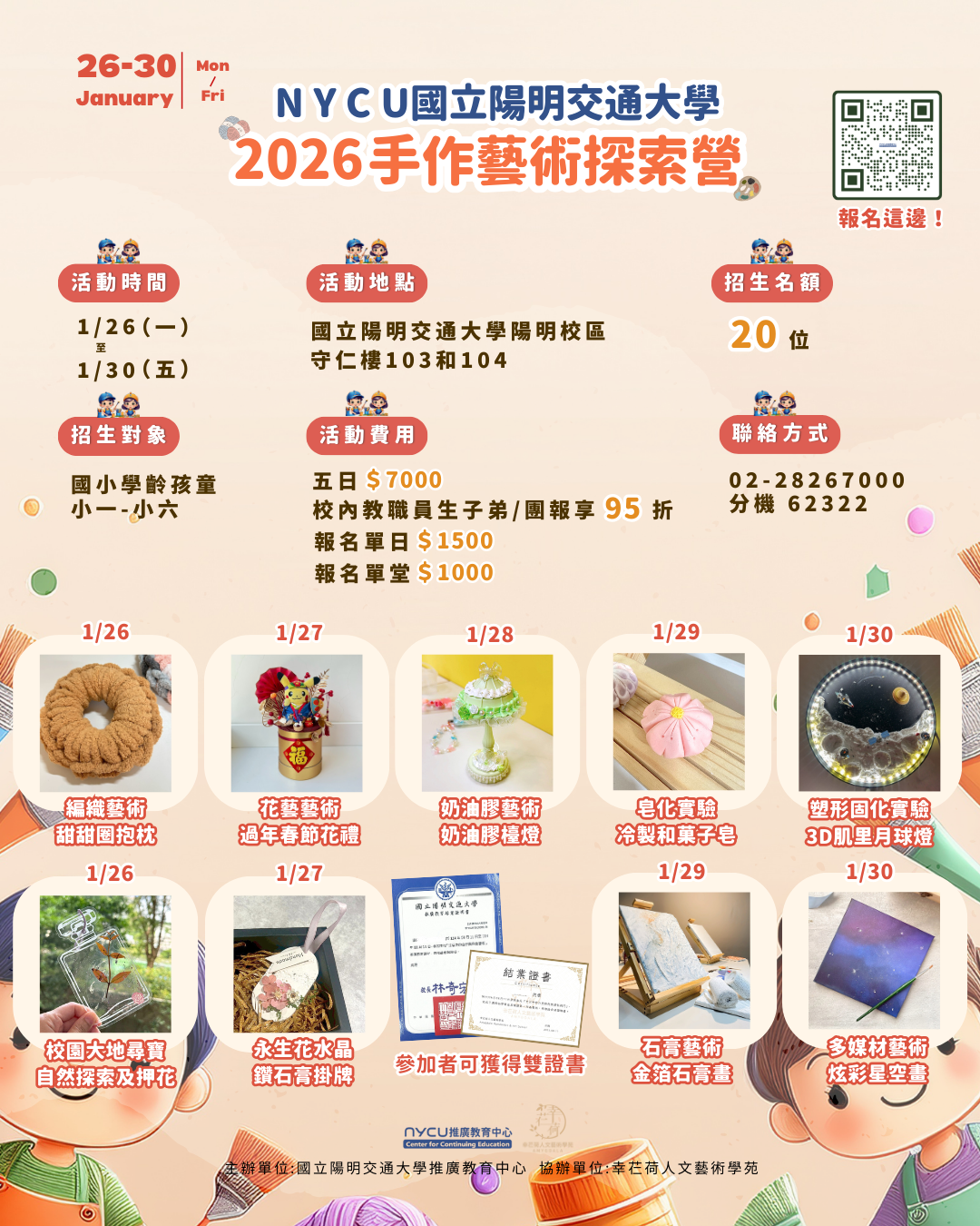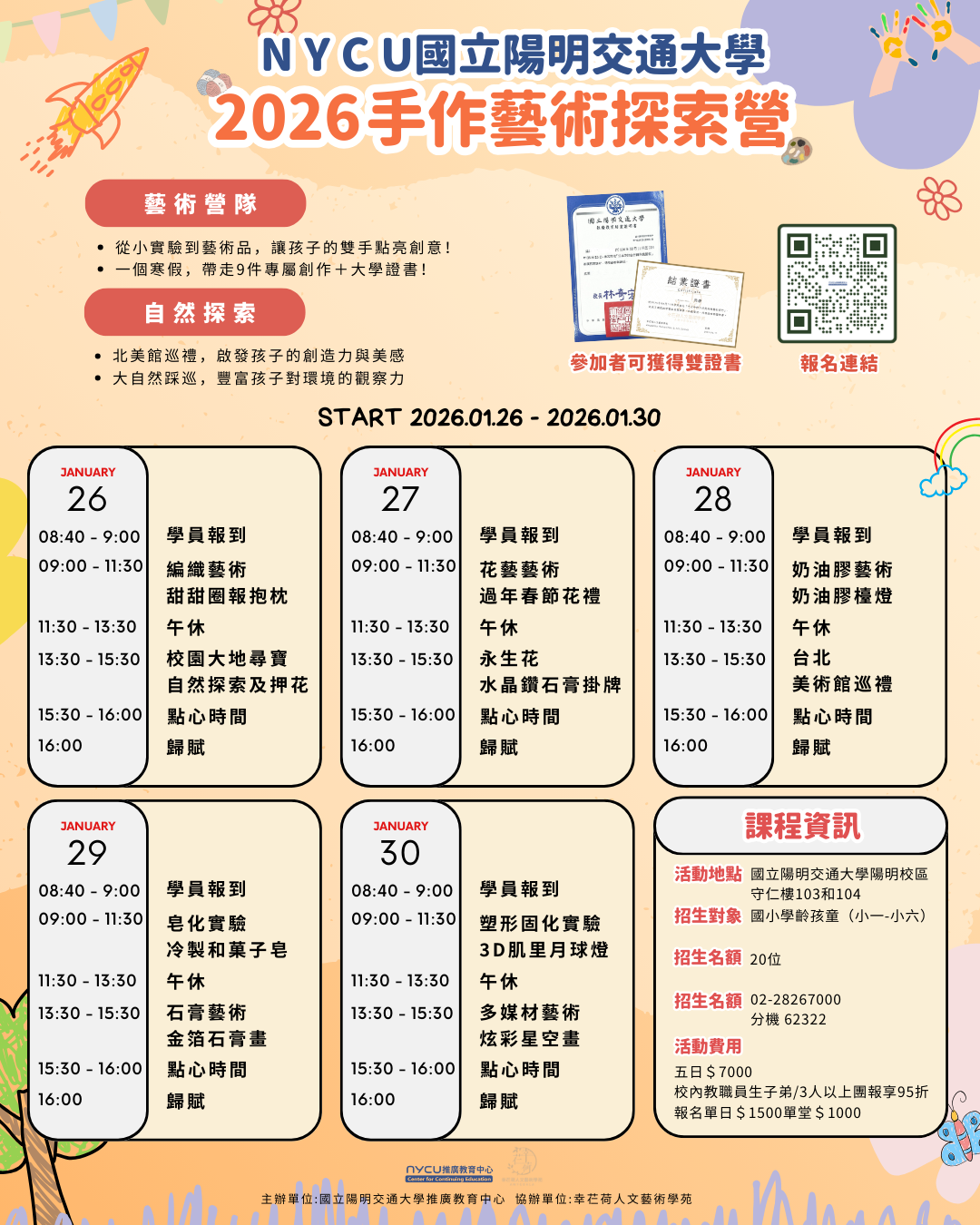一、本校推廣教育中心將於115年寒假辦理「2026手作藝術探索營」5日兒童課程,引導孩童探索手作藝術創作的樂趣。