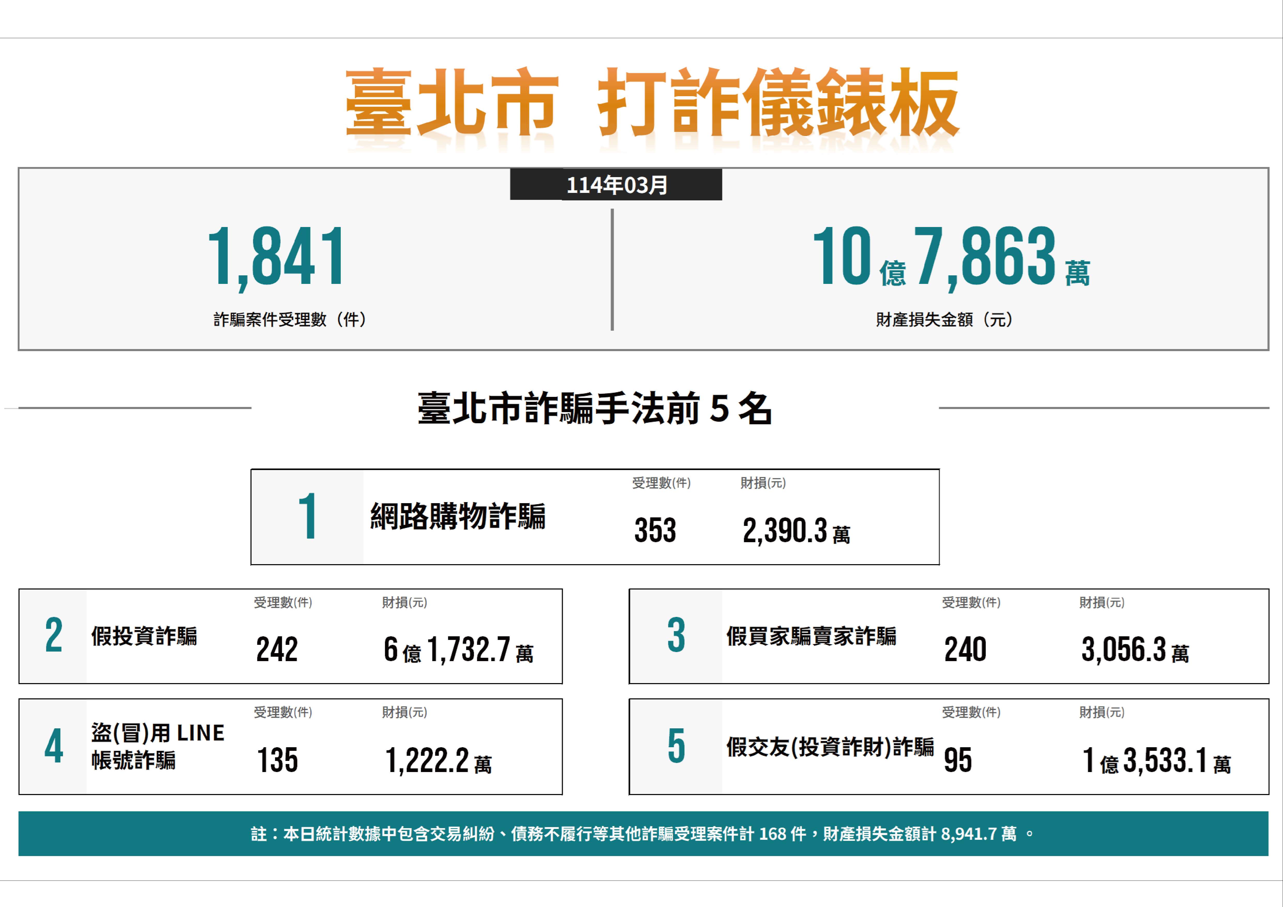 二、分析本市114年3月各類詐欺案件發生數共計1,841件,財損新臺幣(以下同)10億7,863萬元,前3大詐欺手法受理件數及財損金額:
