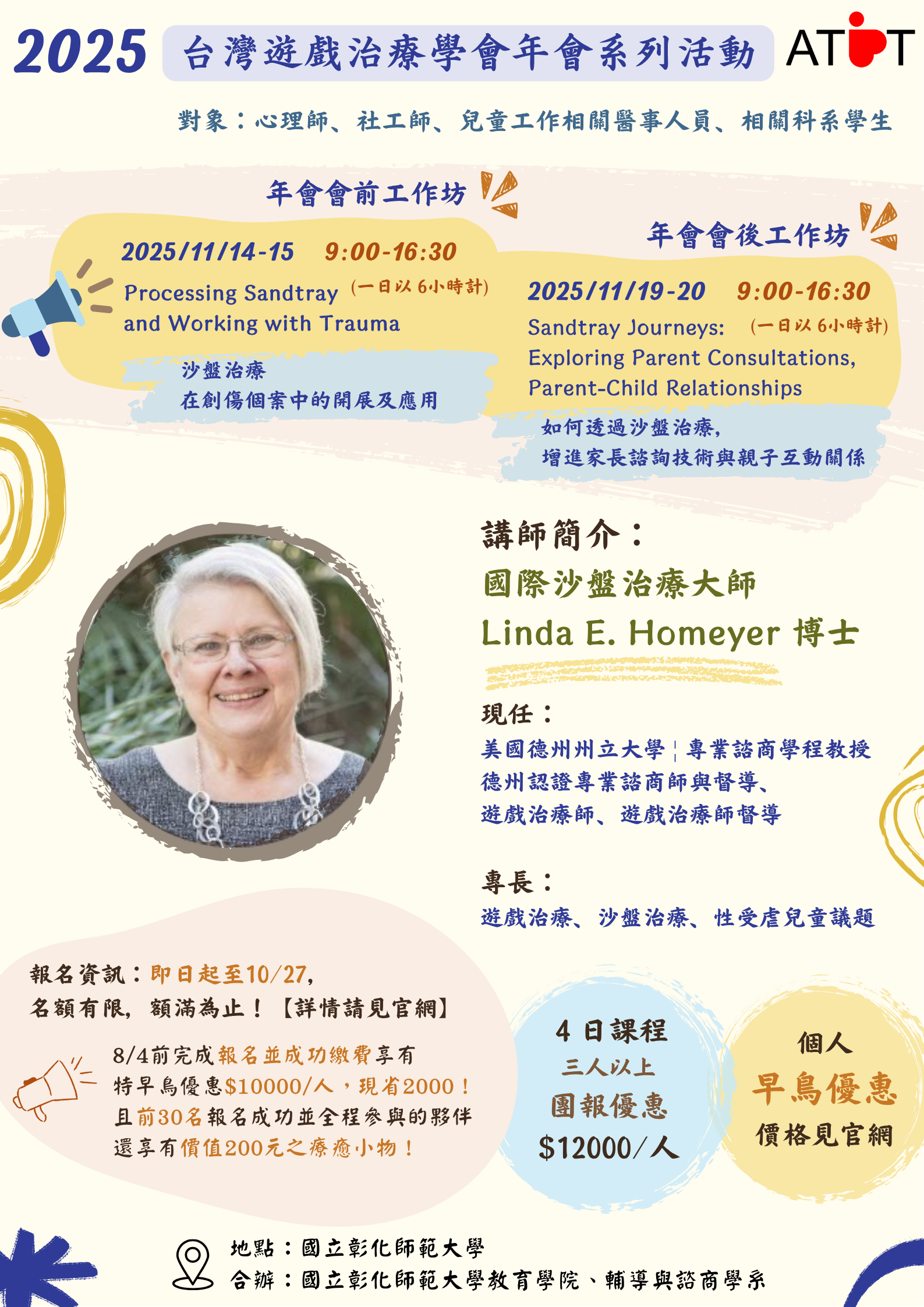 主旨:本會與國立彰化師範大學教育學院、輔導與諮商學系,將 於114年11月14、15日;11月19、20日共同舉辦【台灣遊戲治療學會年會系列活動】沙盤治療在創傷個案中的開展 及應用;如何透過沙盤治療增進家長諮詢技術與親子互動 關係,詳情如說明及附件,敬請貴單位協助張貼宣傳與鼓 勵貴單位相關人員參加。