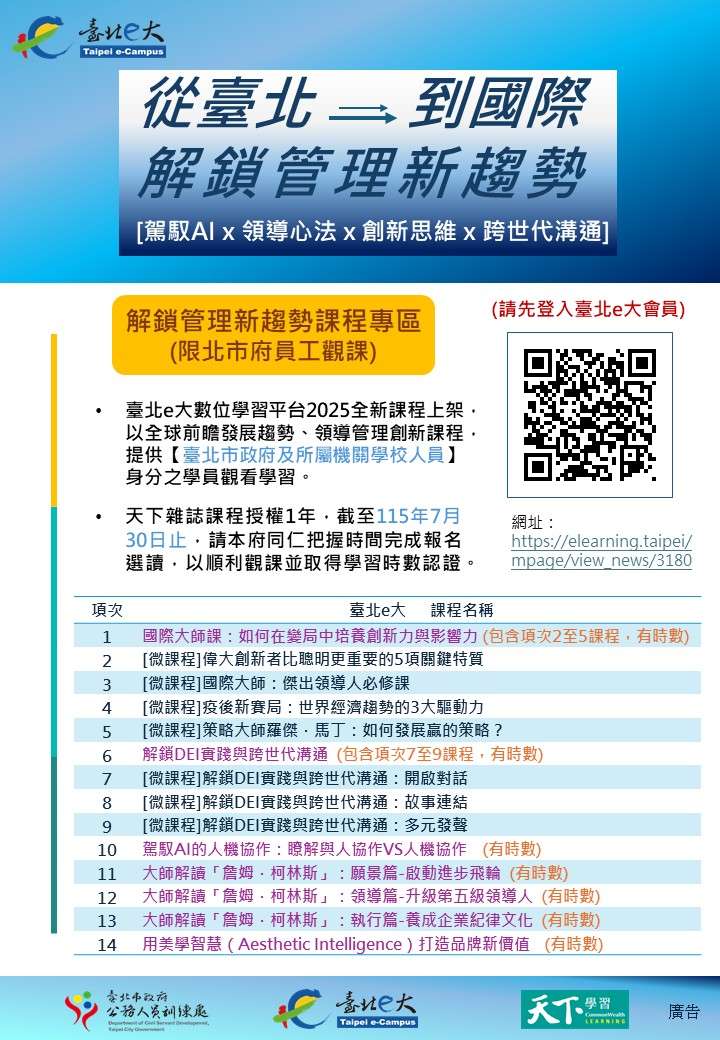 一、為持續引領本府同仁掌握國際趨勢及前瞻觀點新知,臺北e 大數位學習平臺2025全新課程上架,以全球前瞻發展趨 勢、領導管理創新課程,提供「臺北市政府及所屬機關學 校人員」身分之學員觀看學習。 二、旨揭數位課程由天下雜誌授權1年,截至115年7月30日止, 敬請轉知所屬人員踴躍至臺北e大數位學習網選讀學習。課 程請上:「解鎖管理新趨勢課程專區」 https://elearning.taipei/mpage/view_news/3180。(請 先登入臺北e大會員,課程清單如附件)
